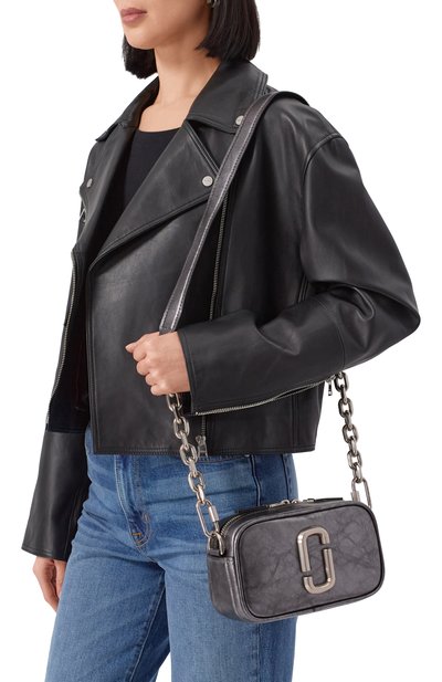 Стеганую сумку Snapshot со скользящим ремешком-цепочкой сшили из денима. Аксессуар с накладным карманом сзади и крупной эмблемой спереди застегивается встречной молнией.