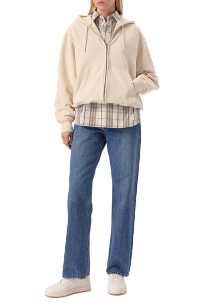 Для создания кроссовок Re-Motion выбрали комбинацию замши и нейлона с узором GG Supreme, повторив этот мотив в тиснении на язычке. Брендированный задник из гладкой кожи дополнили петлей, сквозь которую продели съемный ремешок на щиколотку. Пару установили на подошву с шипами в виде эмблемы Interlocking G.