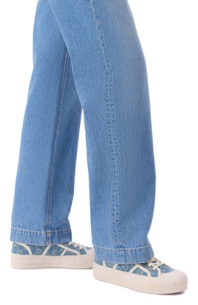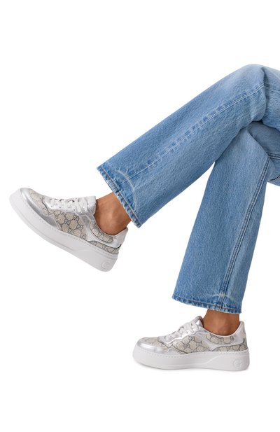 Кеды GG Gucci Tennis 1977 выполнили из канваса с жаккардовым мотивом GG Supreme, которому вторит узор на широкой подошве. Модель с контрастным кантом украсили лентой Web по бокам и брендированной нашивкой на язычке.