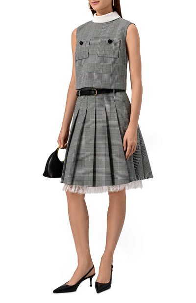 Мини-юбку в широкую складку выполнили из клетчатой шерстяной ткани, а однотонную отделку, создающую иллюзию многослойности, – из хлопкового поплина. Модель застегивается сбоку потайной молнией.