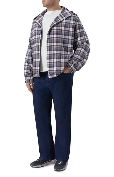 Клетчатую рубашку свободного кроя сшили из хлопка. Края модели со спущенной линией плеч и нагрудным карманом будто покрыли краской, создающей градиентный эффект.