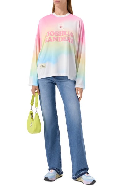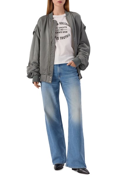 Широкие расклешенные джинсы с пятью карманами выполнили из неэластичного денима. Выбеленную модель с необработанным асимметричным низом декорировали небольшими потертостями по краям.