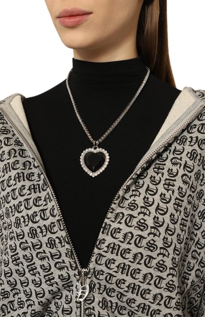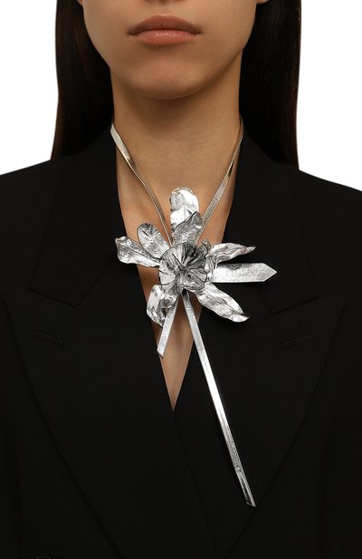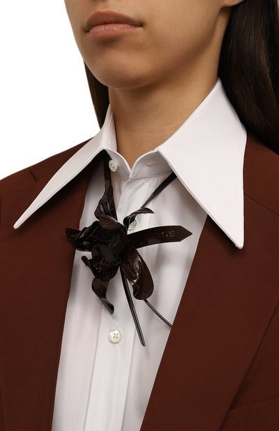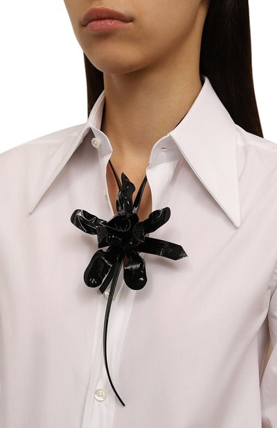 Чокер из полиэстеровой ленты с брендированной металлической деталью завязывается бантом сзади. Аксессуар украсили кристаллами и фигурными бусинами разных форм из смолы.