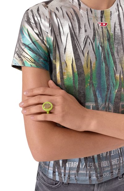 Коктейльное кольцо украсили композицией из кристаллов круглой огранки и кабошонов пренита. Асимметричную основу аксессуара выполнили из латуни с золотистым финишем.