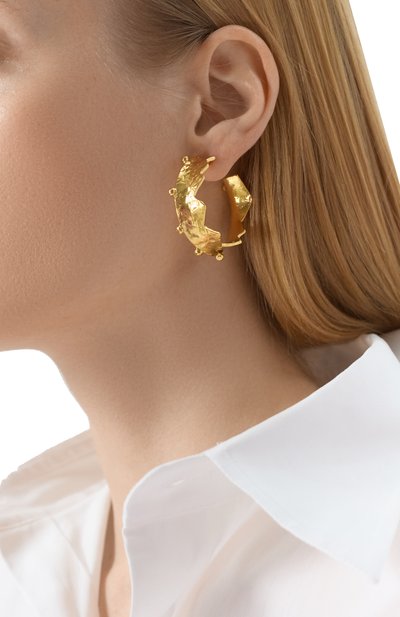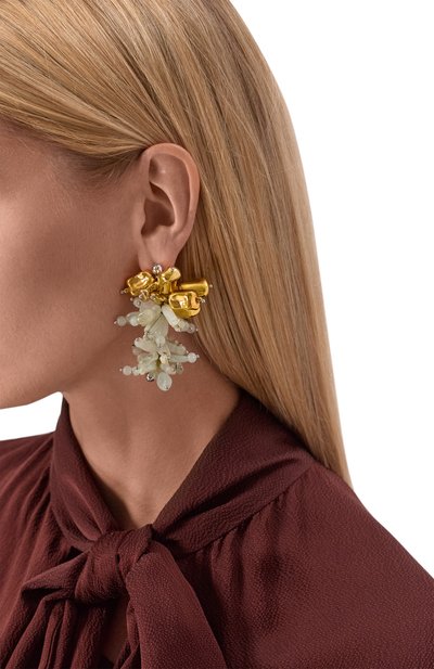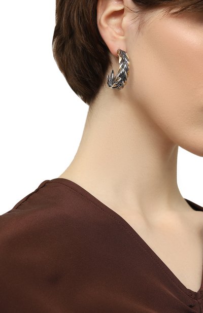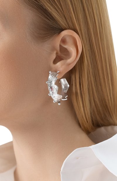 Серьги с застежками-пусетами изготовили из латуни с серебристым финишем. Аксессуар дополнили скульптурными подвесками из различных по размеру и форме бусин тигрового глаза.