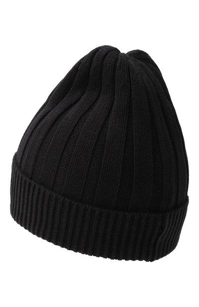 Для создания шапки-бини в крупный рубчик использовали акриловую пряжу. Широкий отворот эластичного аксессуара украсили вставкой с логотипом бренда.