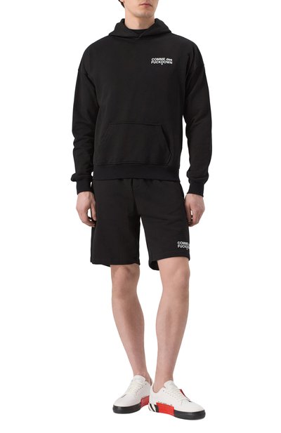 Худи из хлопкового трикотажа с добавлением полиэстера украсили брендированными принтами спереди и на спинке. Контрастный декор поддержали имитацией брызг краски. Модель с эластичными манжетами и поясом дополнили карманом «кенгуру».
