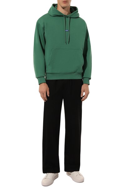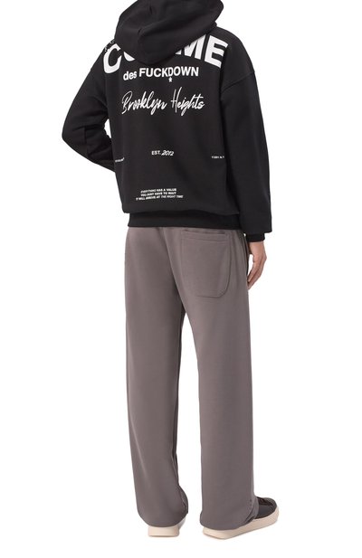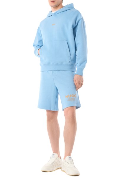 Худи из хлопкового трикотажа с добавлением полиэстера украсили брендированными принтами спереди и на спинке. Контрастный декор поддержали имитацией брызг краски. Модель с эластичными манжетами и поясом дополнили карманом «кенгуру».