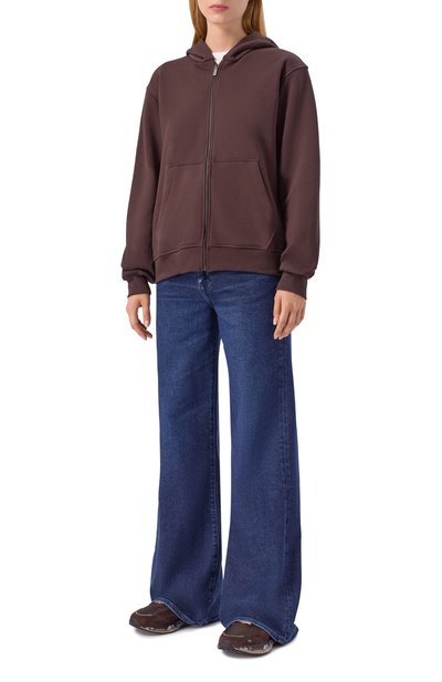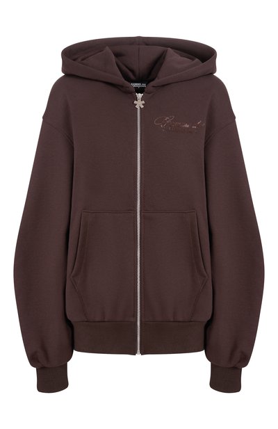 Толстовку с капюшоном и двумя боковыми карманами выполнили из хлопка с добавлением полиэстера. Спереди и сзади изделие украсили состаренным логотипом марки, а молнию дополнили пуллером-эмблемой.