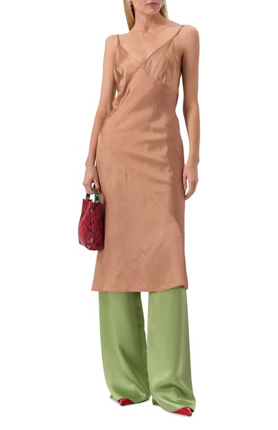 Асимметричное платье с тонкими бретелями сшили из эластичного атласа. Модель украсили кружевными вставками и россыпью кристаллов.