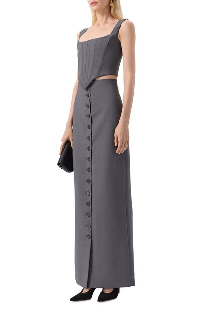 Корсетный топ выполнили из канваса на основе шерсти первого пострига. Модель на тонком подкладе дополнили боковыми вставками в тон. Изделие с усиленными швами застегивается молнией на спинке.