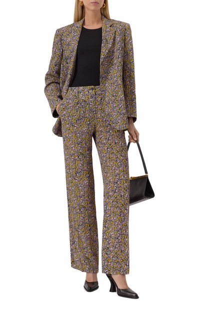 Широкие клетчатые брюки с боковыми и накладными задними карманами выполнили из фактурного смесового твида с добавлением хлопка и шерсти. Модель с бахромой по краям и вдоль швов декорировали крупными кристаллами.