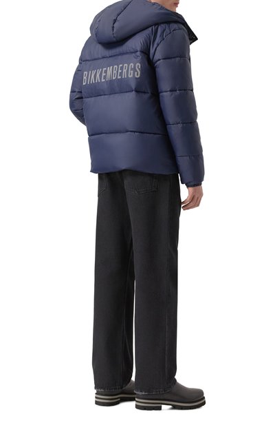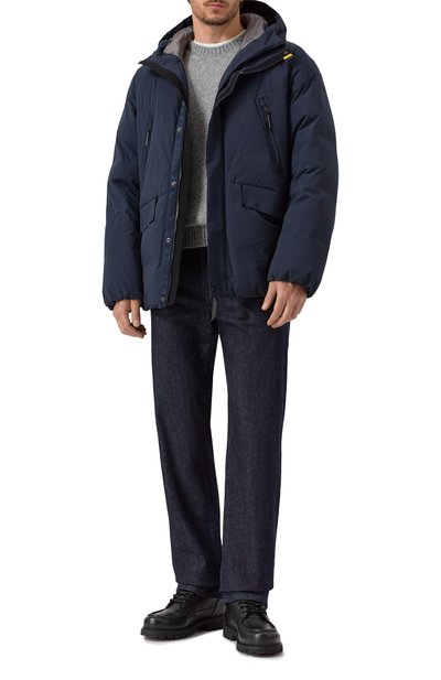 Пуховик на утином пуху выполнили из матового нейлона. Спереди модель с регулируемым капюшоном и боковыми карманами декорировали брендированным патчем.