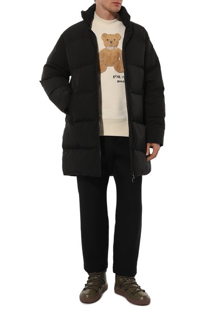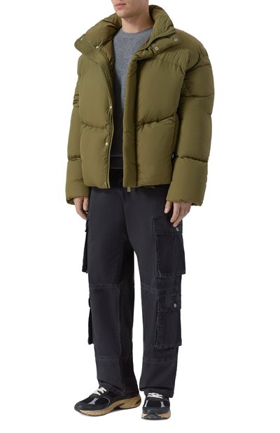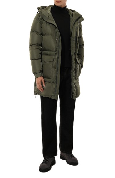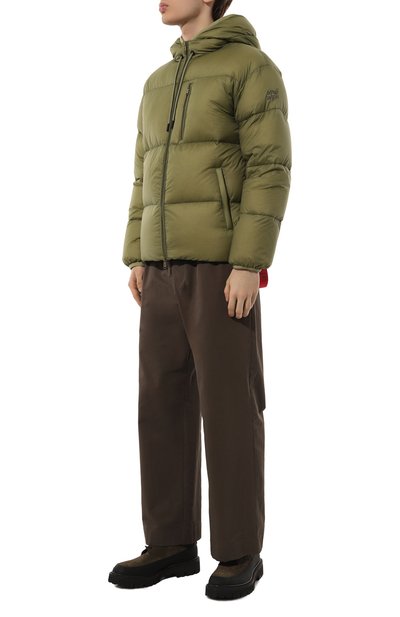 Пуховик на утином пуху выполнили из матового нейлона. Спереди модель с регулируемым капюшоном и боковыми карманами декорировали брендированным патчем.