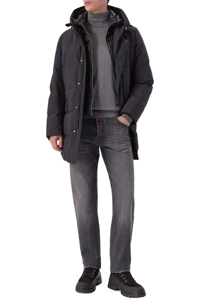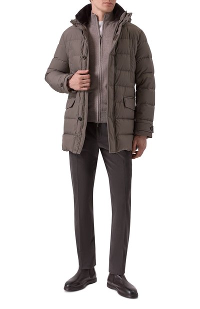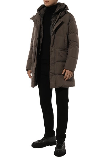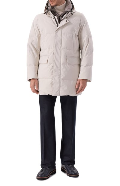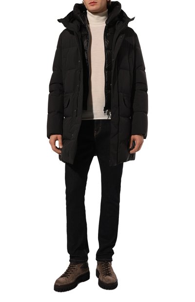 Стеганую куртку на утином пуху выполнили из ветро- и влагозащитного полиэстера. Модель с четырьмя внешними и парой внутренних карманов дополнили съемной манишкой с регулируемым капюшоном. Пуховик застегивается молнией, скрытой под штормовой планкой.