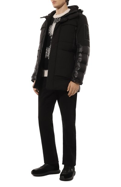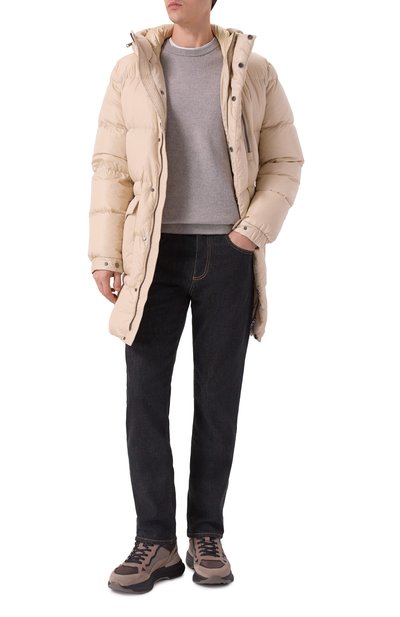 Стеганую куртку на утином пуху выполнили из ветро- и влагозащитного полиэстера. Модель с четырьмя внешними и парой внутренних карманов дополнили съемной манишкой с регулируемым капюшоном. Пуховик застегивается молнией, скрытой под штормовой планкой.