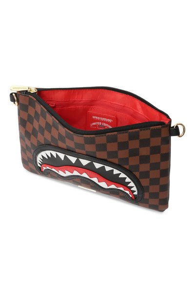 Клатч с декором Dripping Sharks in Paris выполнили из полимерного материала, напоминающего тисненую кожу. Аксессуар со съемными ручкой-петлей и плечевым ремнем дополнили перемычкой на задней панели и карманом с молнией внутри.