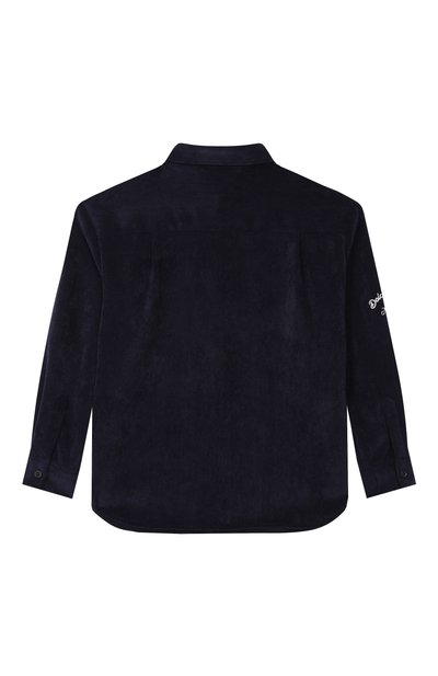 Для создания oversize-рубашки с воротником button down выбрали стрейчевый вельвет из полиэстера с добавлением полиамида. На правом рукаве вышили контрастный логотип, а левый нагрудный карман подчеркнули фирменной двухслойной пластиной.