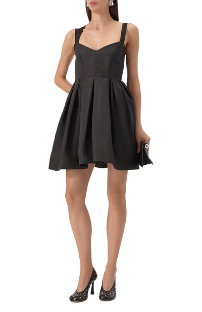 Миди-платье с объемными воланами на подоле сшили из полиэстера в горох. Приталенная модель с регулируемыми бретелями, лифом на косточках и съемным бархатным поясом с бантом застегивается потайной молнией сзади.