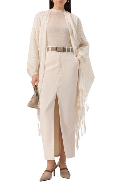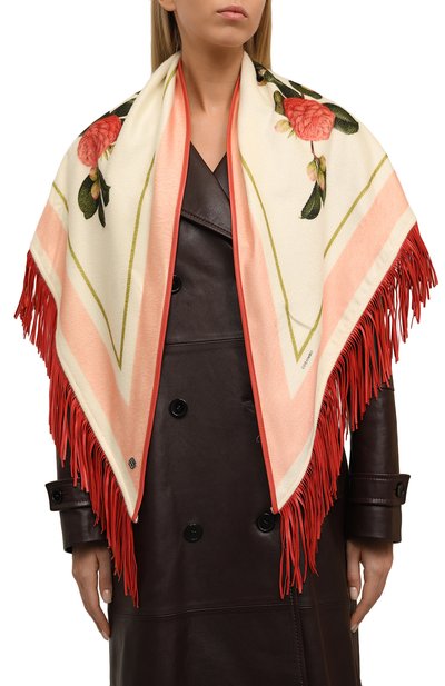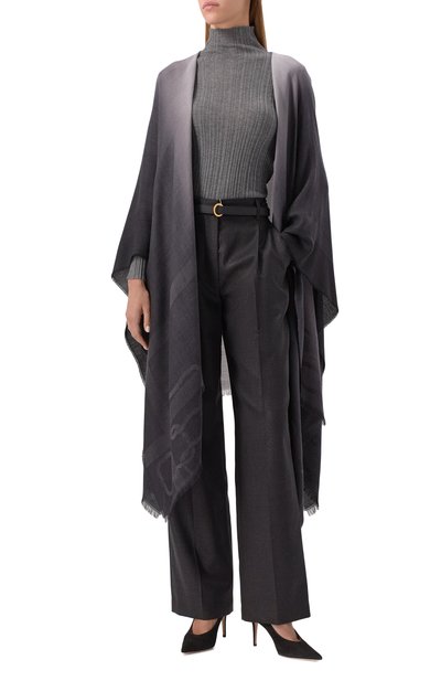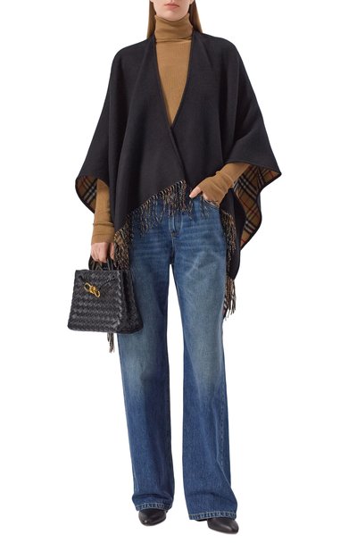 Пончо с контрастной изнанкой выполнили из ткани double-face на основе шерсти и кашемира. Модель с жаккардовым мотивом Equestrian Knight украсили бахромой по краям.