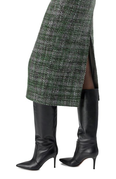 Сапоги с прямым голенищем без застежки выполнили из замши тонкой выделки. Пару с зауженным мысом установили на невысокий устойчивый каблук.