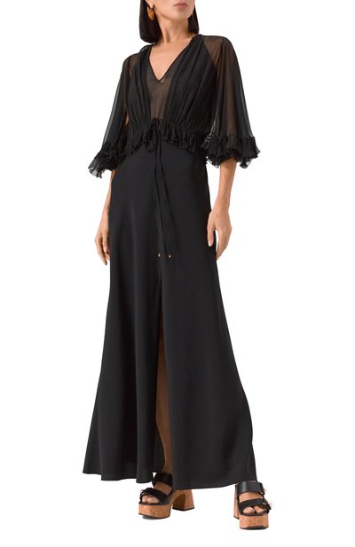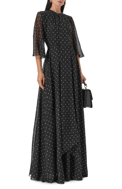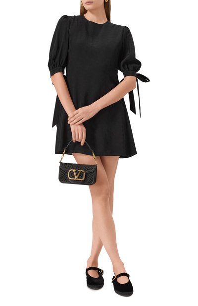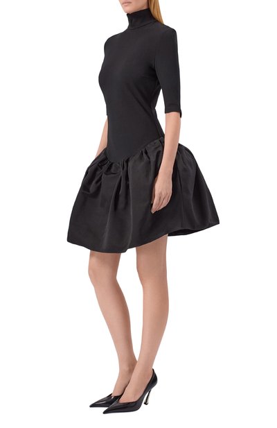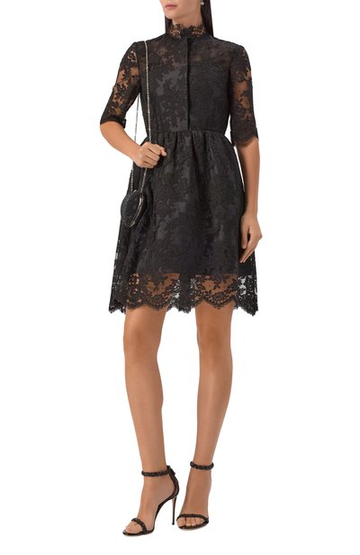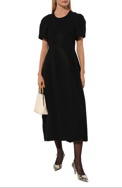 Платье-рубашку с V-образным вырезом, супатной застежкой и объемными рукавами 3/4 выполнили из шерстяного канваса. Модель дополнили съемным воротником из хлопкового поплина.