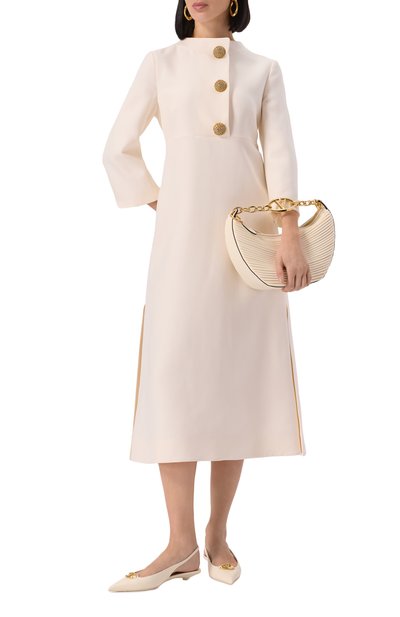 Платье-рубашку с V-образным вырезом, супатной застежкой и объемными рукавами 3/4 выполнили из шерстяного канваса. Модель дополнили съемным воротником из хлопкового поплина.