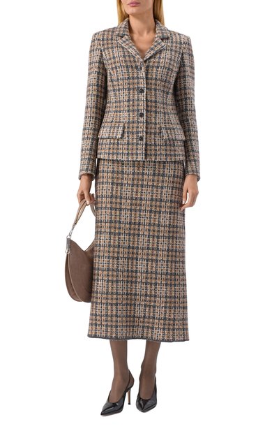 Жакет с подкладом из купро выполнили из клетчатого твида, а для отделки выбрали кожу. Модель со съемными манжетами из экомеха дополнили акцентными пуговицами.