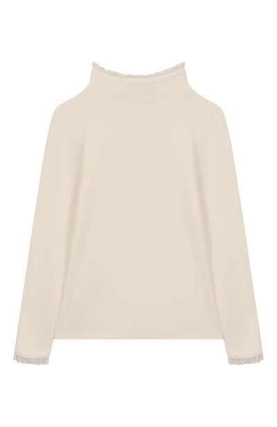 Водолазку выполнили из эластичного вискозного трикотажа в рубчик. Манжеты и высокий ворот отделали кружевом в тон. Спереди модель украсили контрастным логотипом марки.