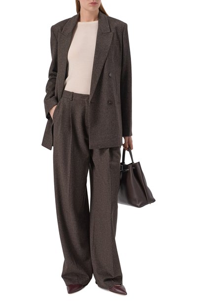 Двубортный жакет Gerusia с остроконечными лацканами дополнили хлястиком сзади. Укороченную модель прямого кроя сшили из шерстяной ткани в клетку «гусиная лапка».