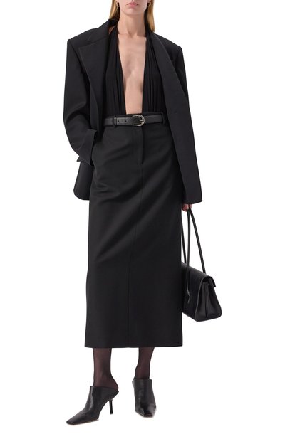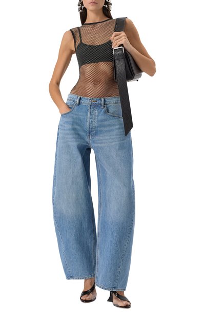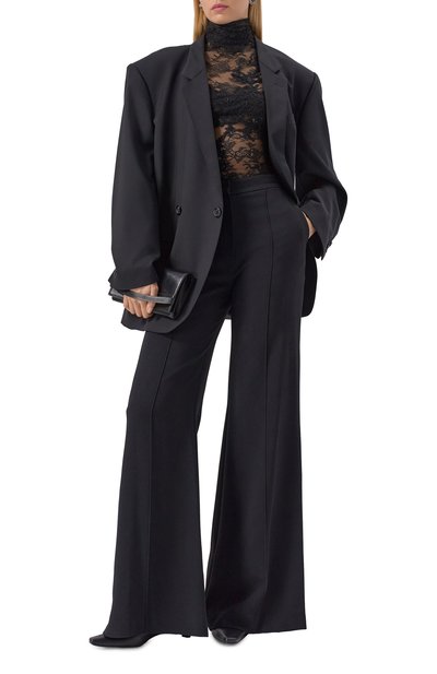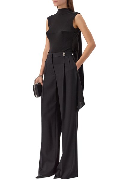 Полупрозрачное боди с цельнокроеным воротником-стойкой выполнили из стрейчевого тюля на основе полиамида. Спереди модель с градиентным геометрическим паттерном декорировали крупным логотипом.