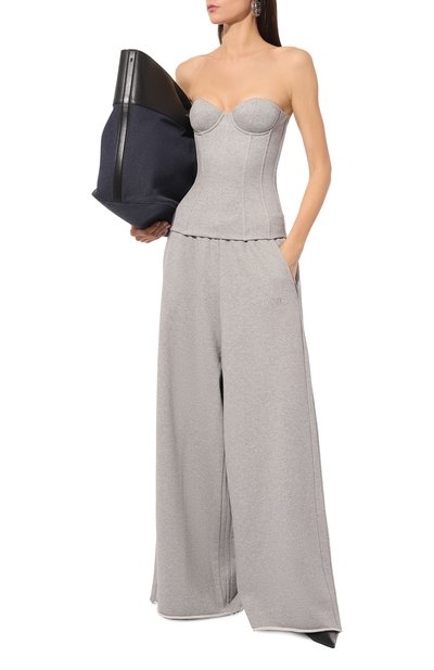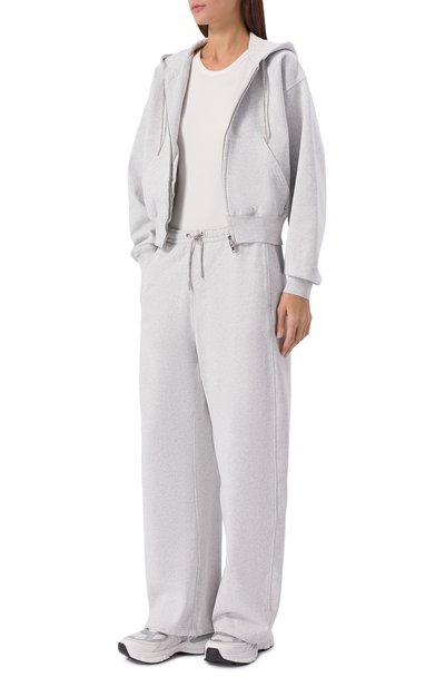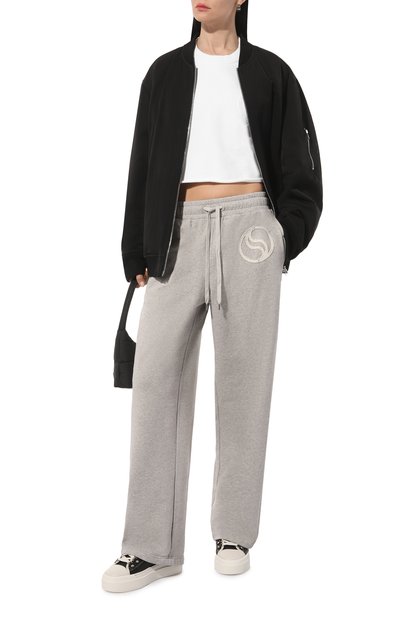 Брюки с регулируемым поясом-кулиской, двумя карманами по бокам и парой листочек сзади выполнили из хлопкового трикотажа. Модель с прямоугольной нашивкой сзади украсили объемным логотипом на правой брючине.