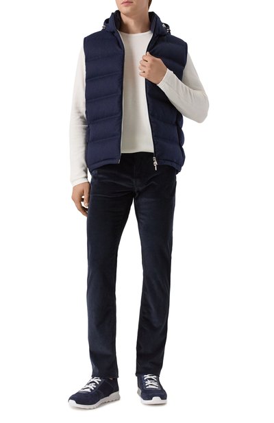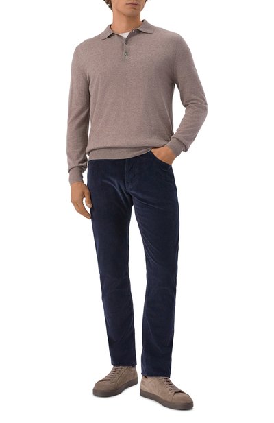 Брюки Scott кроя Slim fit выполнили из стрейчевого хлопкового вельвета с добавлением модала. Окрашенную в готовом виде модель с пятью карманами и застежкой button fly декорировали сзади брендированным патчем из телячьей кожи и заклепкой с эмблемой. В комплекте – платок с принтом Mosaic.
