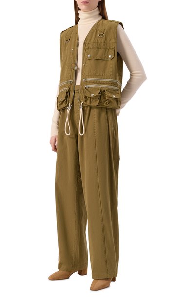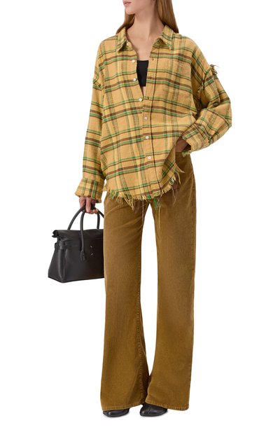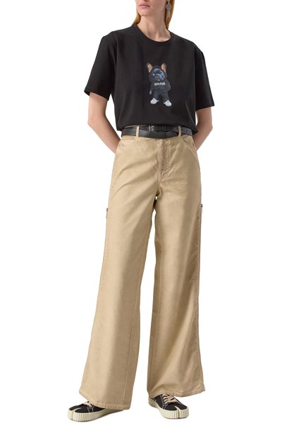 Прямые брюки выполнили из хлопкового вельвета, окрасив модель в готовом виде. Изделие дополнили пятью карманами, декорировав задние вышивкой, а монетный – ярлыком с фирменной эмблемой. На поясе сзади разместили брендированный патч.