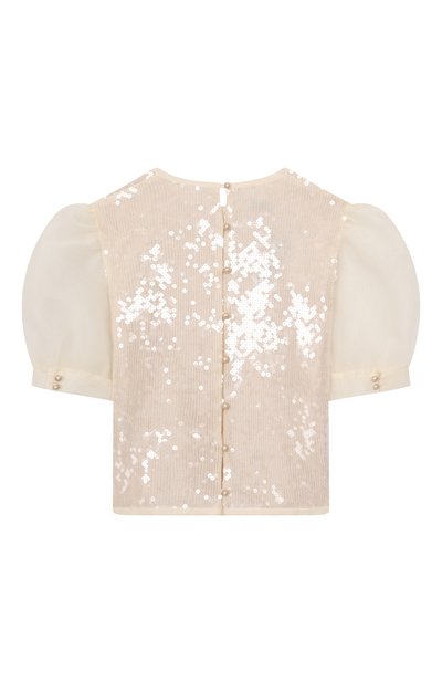 Топ с высоким воротником выполнили из полушерстяного трикотажа. Эластичную модель прямого кроя расшили зеркальными пайетками со всех сторон.