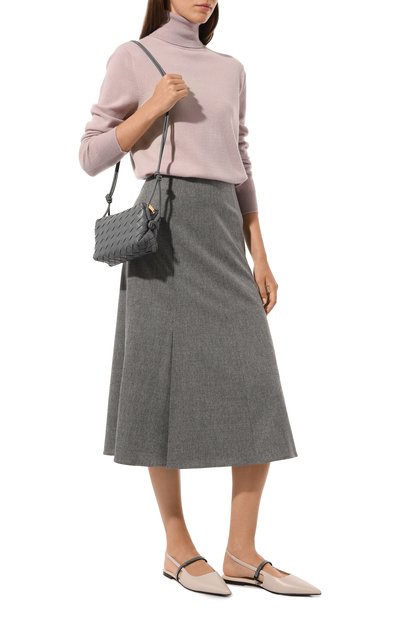 Для создания эластичной миди-юбки А-силуэта использовали меланжевую кашемировую пряжу. Манжету по низу и широкий пояс связали в рубчик.