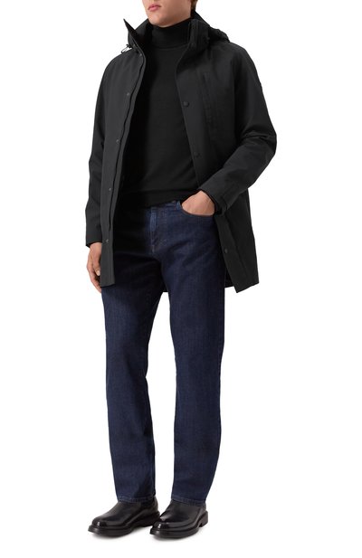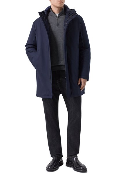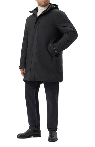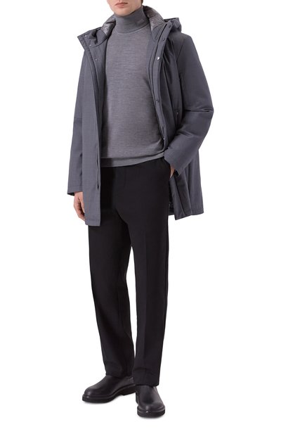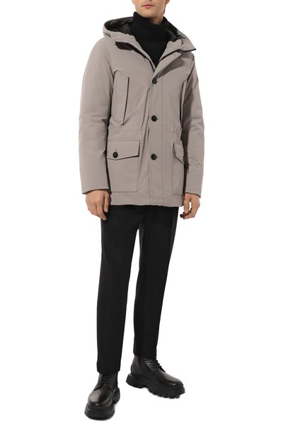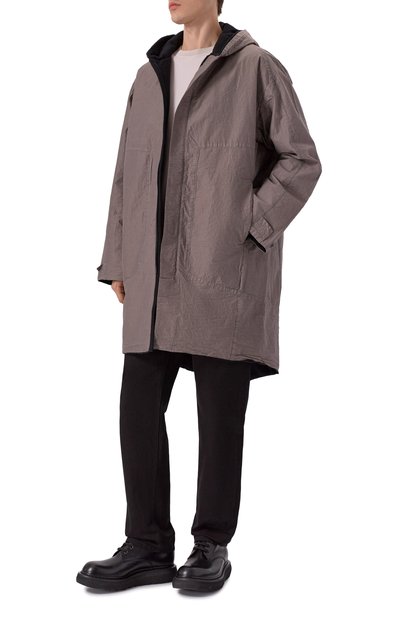 Для создания oversize-парки использовали материал на основе хлопка и шерсти. Модель с большими боковыми карманами и капюшоном застегивается потайной молнией. Манжеты изделия регулируются хлястиками на кнопках.