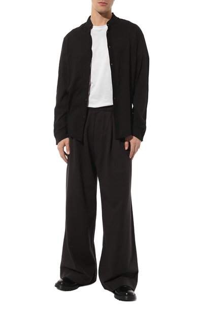 Рубашку прямого кроя выполнили из хлопковой ткани с добавлением полиамида. Модель с воротником-стойкой, окрашенную в готовом виде, дополнили на плечах вставками из фактурной ленты.