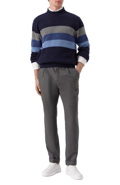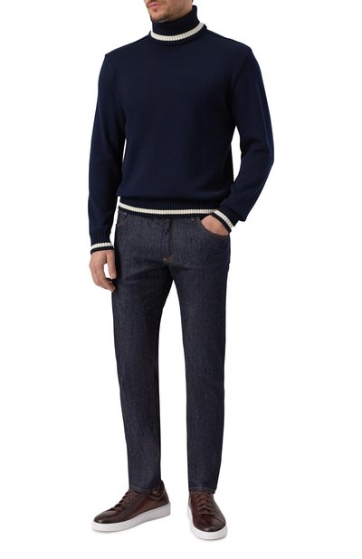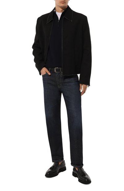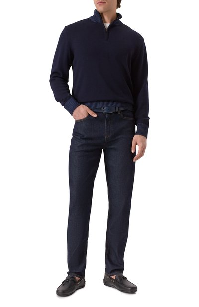 Свитер в рубчик выполнили из шерстяной пряжи. Нейлоновый воротник-стойку на молнии украсили брендированной пластиной сзади.
