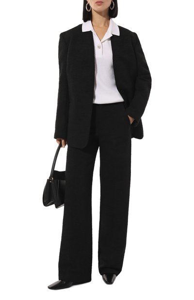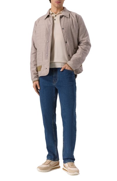 Поло с арановым узором связали из чистого кашемира. Модель с контрастными полосами по краям манжет и пояса в рубчик застегивается двумя роговыми пуговицами.