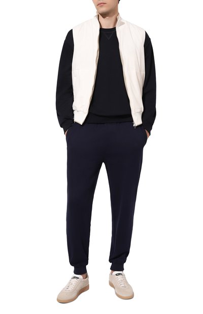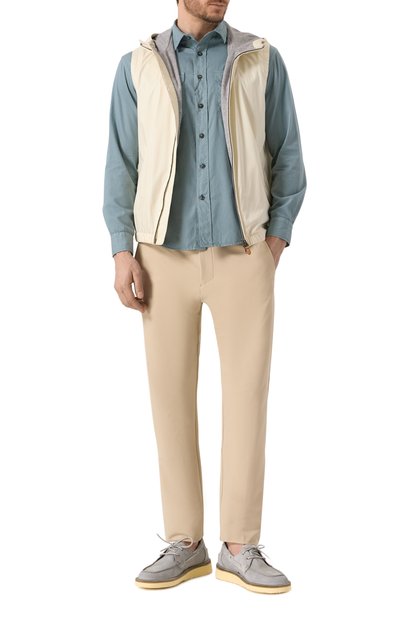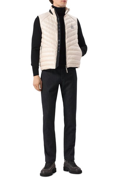 Утепленный жилет с ребристой отделкой выполнили из полиэстера. Модель с трикотажным поясом, внутренним и парой внешних карманов застегивается встречной молнией.