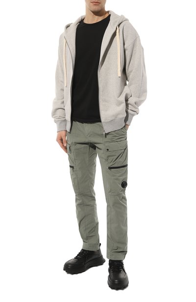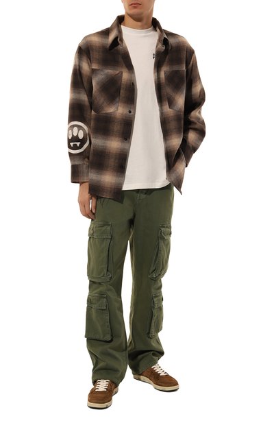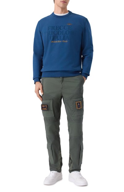 Брюки, вдохновленные антигравитационными костюмами пилотов, выполнили из прочной хлопковой ткани. Модель с молниями на низе и потайной кулиской на поясе дополнили боковыми и задними карманами, а также двумя парами карго. Изделие декорировали вышитым логотипом, металлической эмблемой ВВС Италии и брендированным патчем.