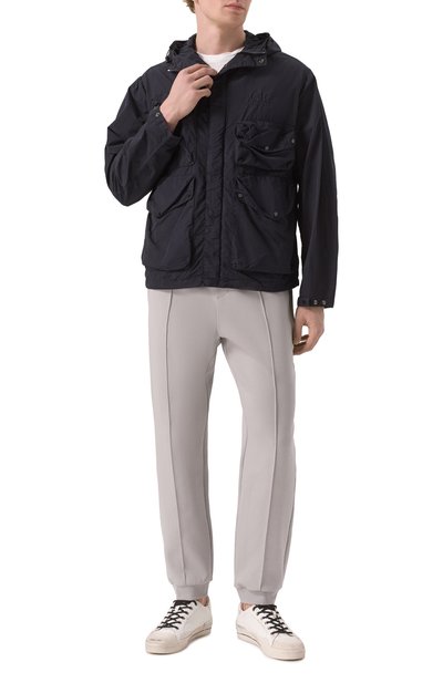 Стеганую куртку с капюшоном, трикотажными манжетами и контрастным кантом по краям сшили из нейлонового рипстопа. Утепленную модель с двумя врезными и парой накладных карманов украсили брендированным патчем.