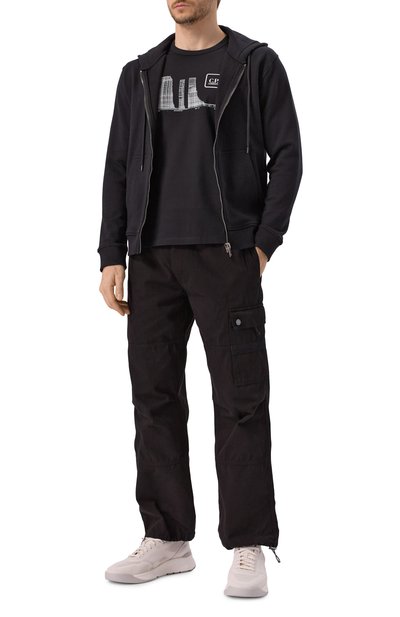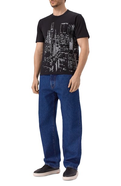 Футболку с неглубокой круглой горловиной в рубчик выполнили из хлопкового трикотажа. Спереди свободную модель со спущенной линией плеч украсили абстрактным принтом.