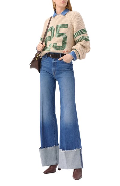 Свитер Swana с рифлеными манжетами и поясом связали арановым узором из пряжи на основе шерсти овцы и альпака. Широкий воротник модели можно трансформировать в высокий ворот, застегнув короткую молнию на горловине.