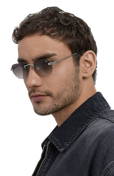 Узкую оправу очков с фирменными T-образными вставками по бокам выполнили из металла, а для заушников выбрали прозрачный полимер. На дужках выгравировали логотип марки, повторив его на одной из градиентных линз. В комплекте – брендированный вельветовый футляр.
