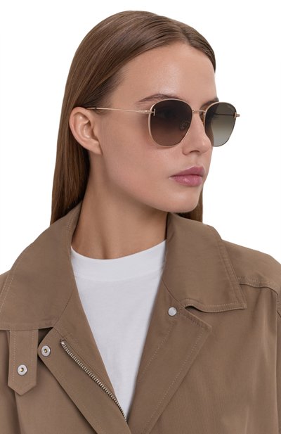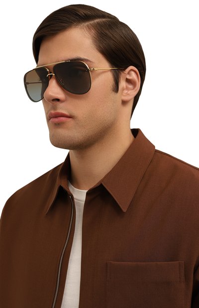 Солнцезащитные очки с заушниками из черепахового ацетата изготовили из металла. Аксессуар с Т-образной накладкой оснастили градиентными линзами, на 100% полностью блокирующими UVA- и UVB-лучи.