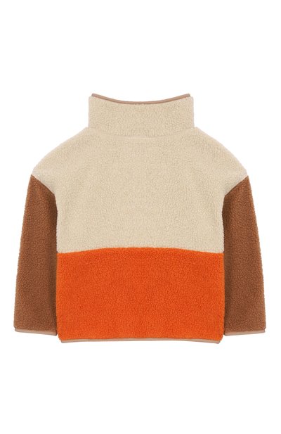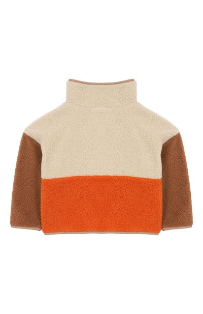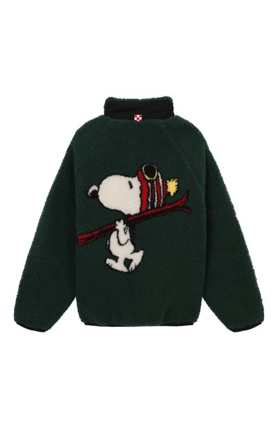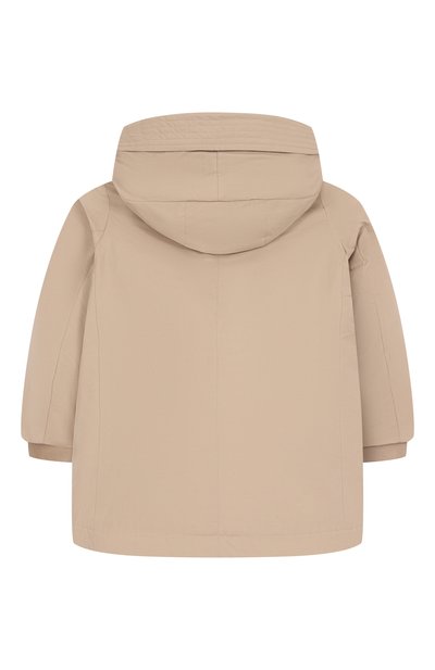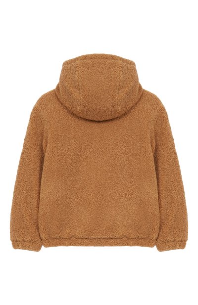 Куртку с капюшоном сшили из фактурного экомеха, напоминающего овчину. Левый рукав украсили фирменным патчем, а один из накладных карманов – логотипом марки. Модель с подкладом застегивается молнией.