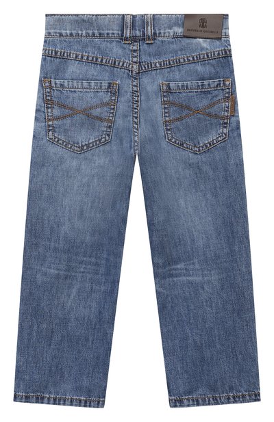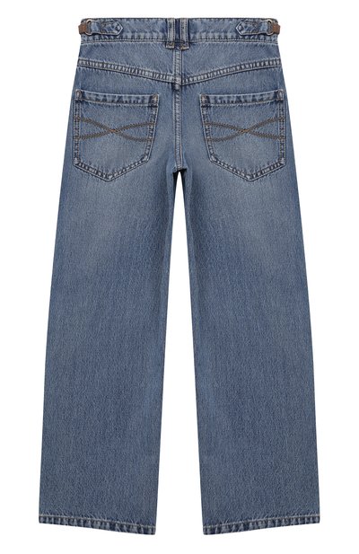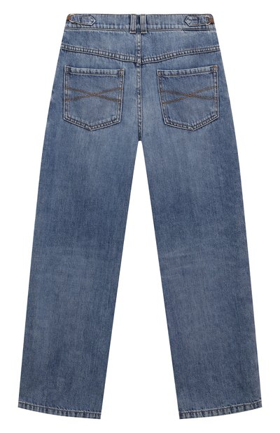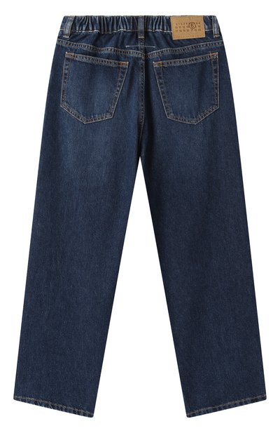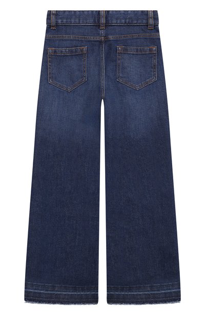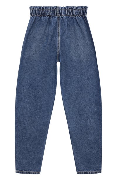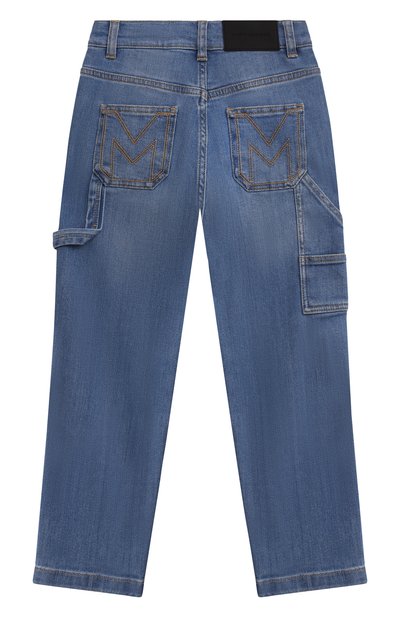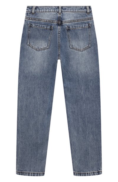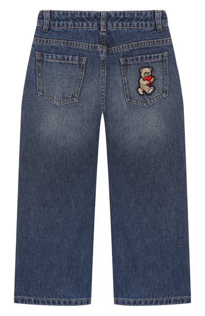 Джинсы прямого кроя выполнили из неэластичного денима. Модель с пятью карманами декорировали вышитыми логотипом спереди и изображением фирменного медвежонка Teddy Bear сзади.