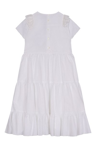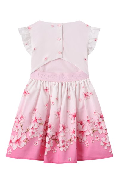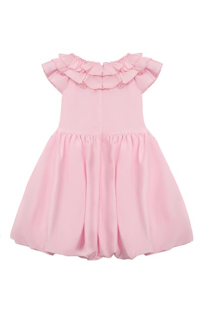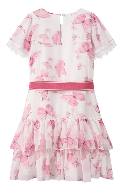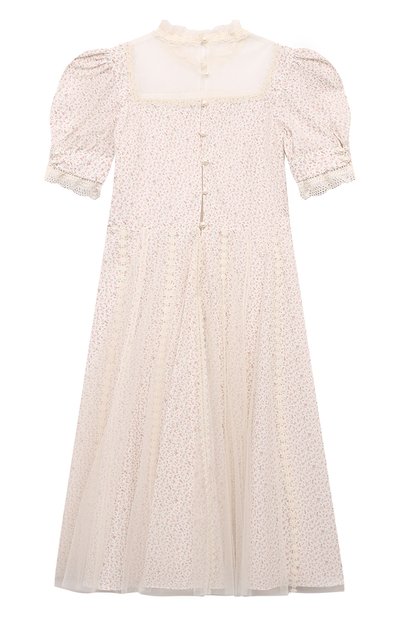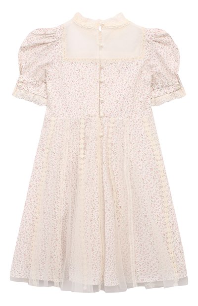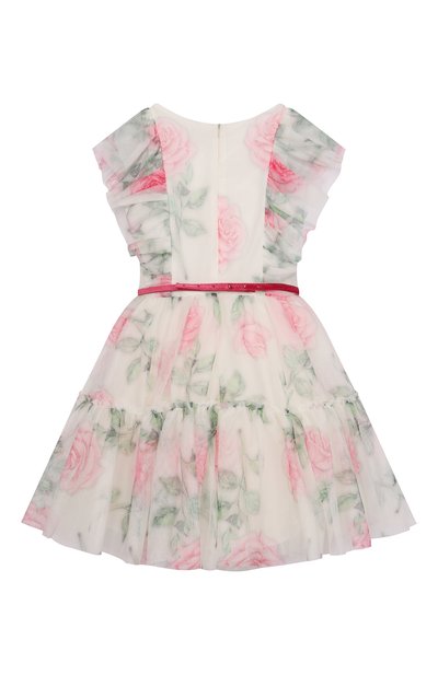 Платье с брендированным фл окированным принтом выполнили из тюля, предусмотрев подклад. Модель с короткими рукавами-крылышками и драпированным подолом застегивается потайной молнией сзади.